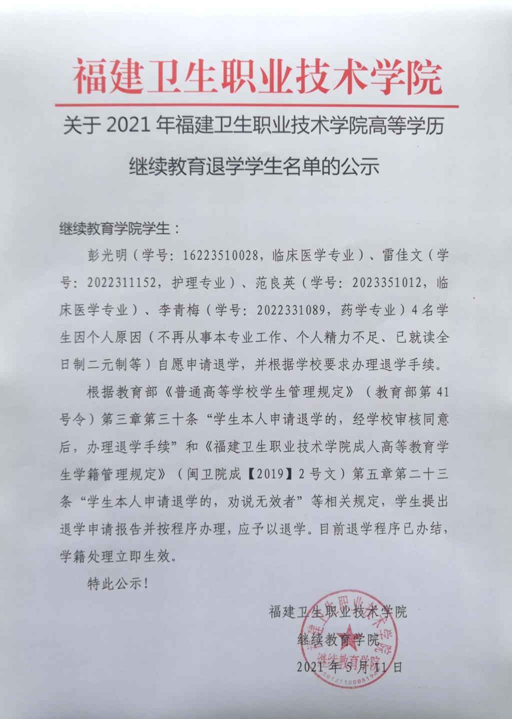 關(guān)于2021年福建衛(wèi)生職業(yè)技術(shù)學(xué)院高等學(xué)歷繼續(xù)教育退學(xué)學(xué)生名單的公示