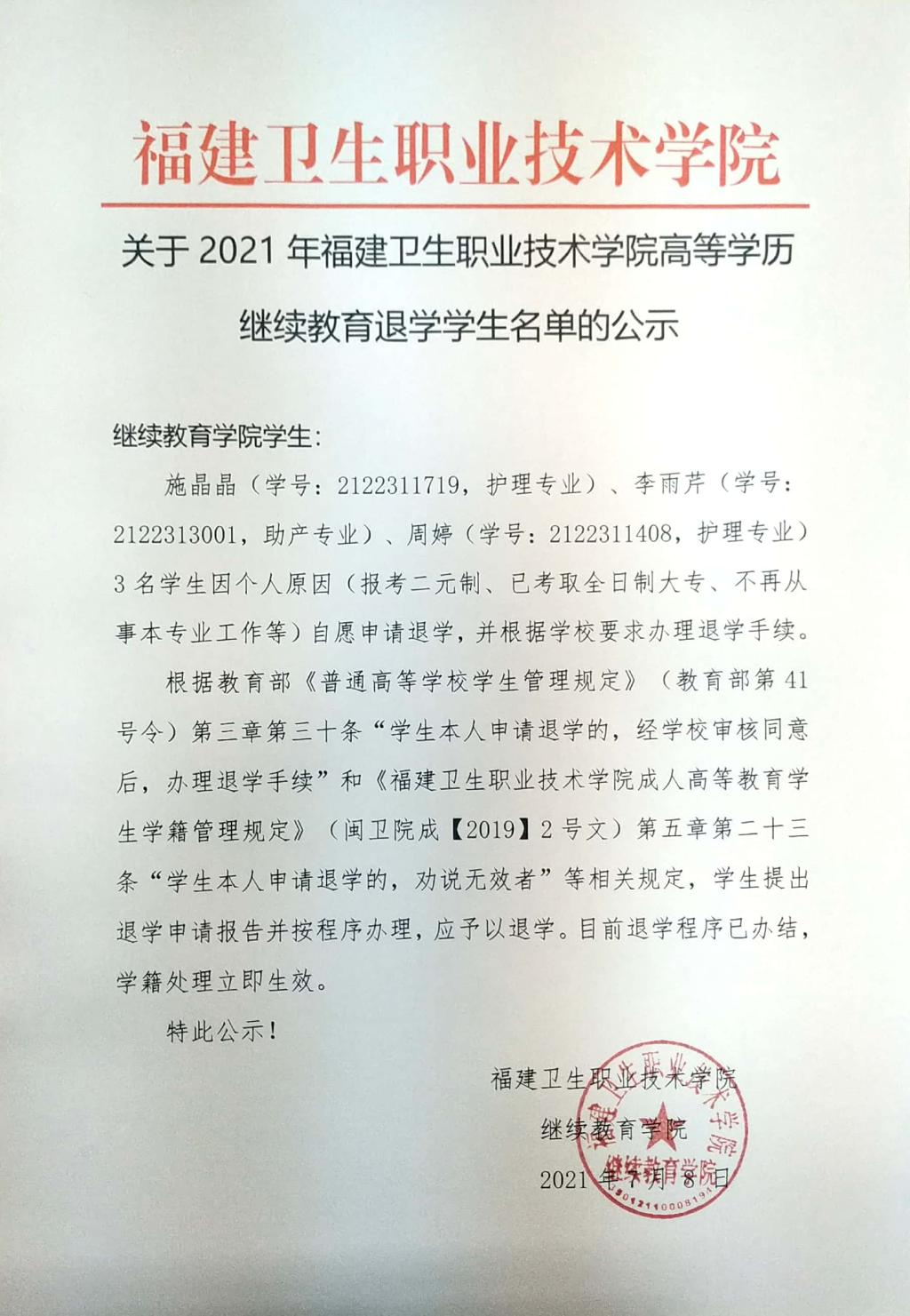 關(guān)于2021年福建衛(wèi)生職業(yè)技術(shù)學(xué)院高等學(xué)歷繼續(xù)教育施晶晶等3名退學(xué)學(xué)生名單的公示