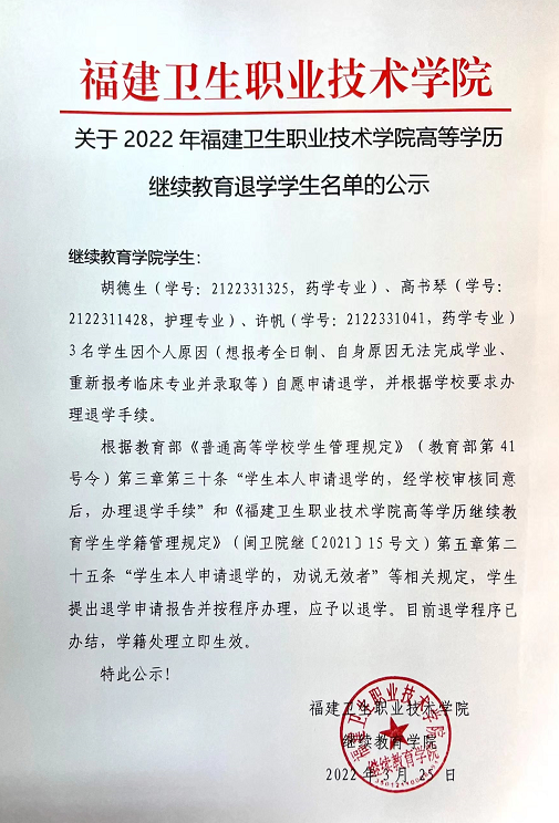 關(guān)于2022年福建衛(wèi)生職業(yè)技術(shù)學(xué)院高等學(xué)歷繼續(xù)教育退學(xué)學(xué)生名單的公示