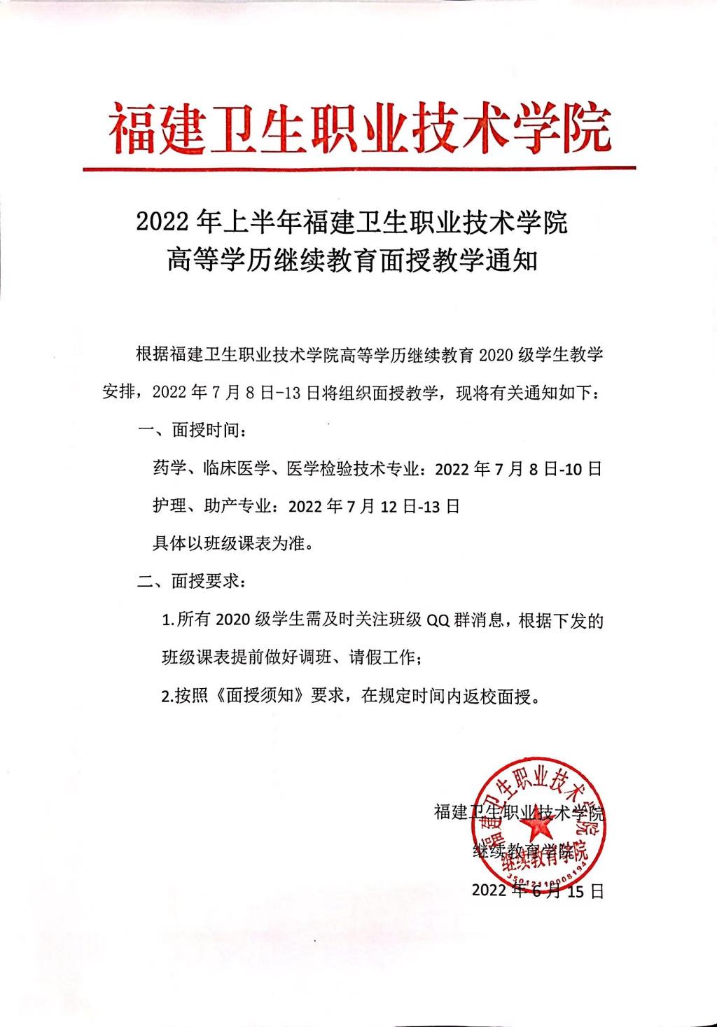 2022年上半年福建衛(wèi)生職業(yè)技術學院 高等學歷繼續(xù)教育面授教學通知