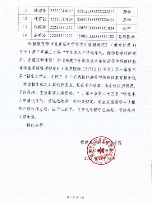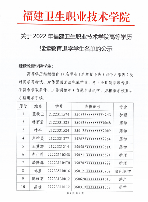 關(guān)于2022年福建衛(wèi)生職業(yè)技術(shù)學(xué)院高等學(xué)歷繼續(xù)教育藍(lán)秋云等14名退學(xué)學(xué)生名單的公示