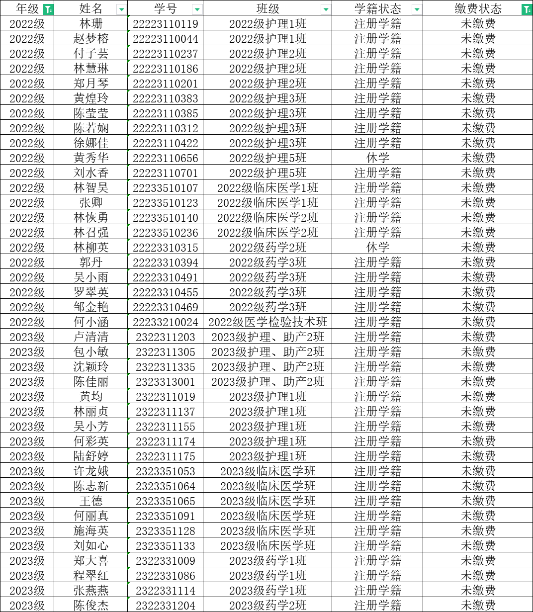 2024年1月10日開始,福建衛(wèi)生職業(yè)技術(shù)學(xué)院高等學(xué)歷繼續(xù)教育學(xué)生學(xué)費均在“福建衛(wèi)生職業(yè)技術(shù)學(xué)院”財務(wù)平臺收繳,截至2024 年2月20日,2024學(xué)年學(xué)費繳納已截止,林珊等40位學(xué)生(名單見附件)未按規(guī)定繳費。請相關(guān)學(xué)生從即日起七日內(nèi)與本校繼續(xù)教育學(xué)院聯(lián)系,辦理休學(xué)或者退學(xué)等相關(guān)手續(xù),逾期我院將對該批學(xué)生按照自動退學(xué)處理。