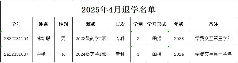 林培聰、盧艷平等2名學(xué)生因個人原因(公司有事,不方便離開,無法繼續(xù)來校參加面授等原因)自愿申請退學(xué),并根據(jù)學(xué)校要求辦理退學(xué)手續(xù)。
