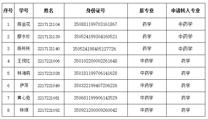根據(jù)中國藥科大學(xué)繼續(xù)教育學(xué)院相關(guān)管理規(guī)定,2022級陳金花等8人因個人工作需要等原因,提出轉(zhuǎn)專業(yè)申請,經(jīng)班主任審核,我站研究審議,該3名學(xué)生符合轉(zhuǎn)專業(yè)條件,同意轉(zhuǎn)專業(yè),并上報(bào)中國藥科大學(xué)繼續(xù)教育學(xué)院審批。 現(xiàn)將轉(zhuǎn)專業(yè)名單予以公示,公示期12月19日至12月23日,如有異議,請以書面形式在公示期內(nèi)向我站反饋。聯(lián)系電話:0591-22869959