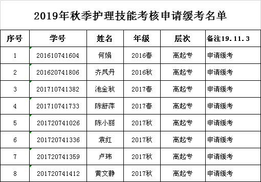 北京中醫(yī)藥大學(xué)遠(yuǎn)程教育福建衛(wèi)生職業(yè)技術(shù)學(xué)院學(xué)習(xí)中心2019年秋季護(hù)理技能考核工作已于11月3日完成,現(xiàn)將考核不合格名單公示如下,請不合格同學(xué)及時(shí)關(guān)注學(xué)習(xí)中心網(wǎng)站(福建衛(wèi)生職業(yè)技術(shù)學(xué)院官網(wǎng)http://www.fjwzy.cn/jjzx/ycjy/bjzyydxycjyfjwszyjsxyxxzx/jxtz.htm)或者微信公眾號的通知,并于明年春季參加補(bǔ)考。