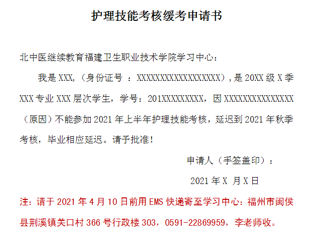 3.若有特殊情況(如懷孕、坐月子、生病等)不能參加護理技能測試的,請于4月10日前向學習中心提交書面緩考申請延遲到2021年秋季測試,畢業(yè)時間相應延遲。(緩考申請見附件3)。