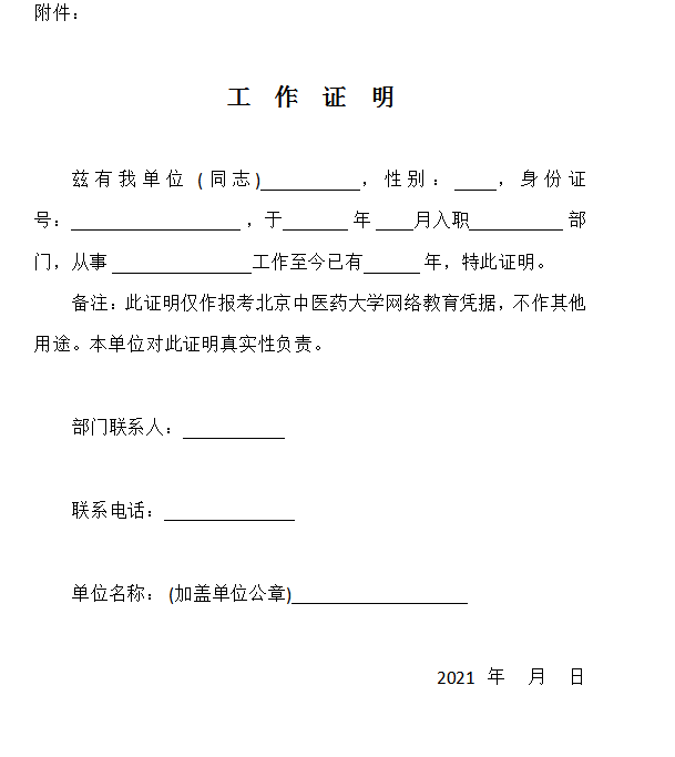 ① 網(wǎng)上打印的報(bào)名表(須單位蓋章簽字、學(xué)生簽字)、工作證明(見(jiàn)附件,須單位蓋章)各1份;
