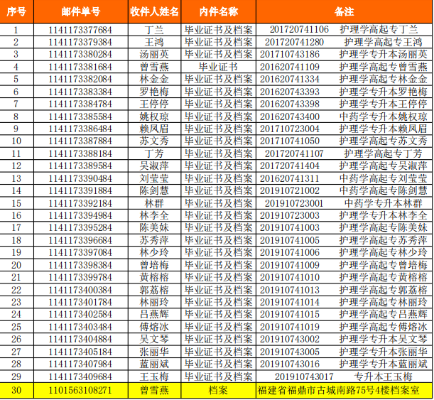 2.寄送材料包括:畢業(yè)證書原件、畢業(yè)證封殼、學(xué)籍檔案、學(xué)費發(fā)票(2019年之前紙質(zhì)發(fā)票,之后為電子發(fā)票)、信息采集剩下照片、錄取花名冊、畢業(yè)備案表,其中錄取花名冊和畢業(yè)備案表已蓋章,均在教育廳和衛(wèi)健委備案完成。更改學(xué)歷和評審職稱會用上相關(guān)備案材料請妥善保管,遺失不補(bǔ)。