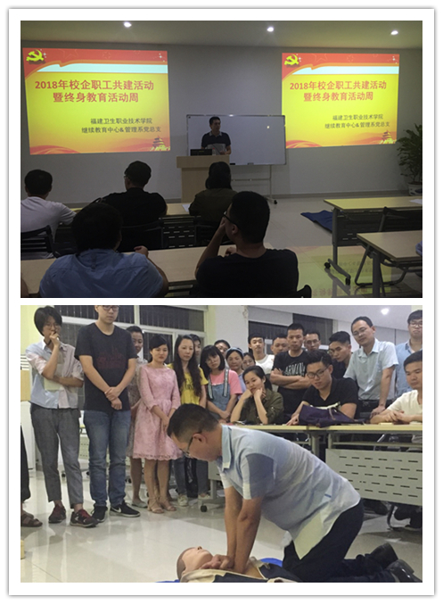本次活動(dòng)由繼續(xù)教育中心何烜老師主持,管理系教師黨員王國(guó)浩講解演示心肺復(fù)蘇術(shù)的操作步驟,管理系教師黨員溫曉黛現(xiàn)場(chǎng)教授辦公室運(yùn)動(dòng)放松方法,吸引了許多職工的積極參與。各位職工紛紛動(dòng)手操作學(xué)習(xí),得到了出席教師黨員的指導(dǎo)。公司職工表示學(xué)到的知識(shí)實(shí)用性強(qiáng),能夠?yàn)樽陨淼慕】蛋l(fā)展有促進(jìn)作用。此次活動(dòng)積極營(yíng)造了終身教育、終身學(xué)習(xí)的良好社會(huì)氛圍;大家深刻地意識(shí)到終身學(xué)習(xí)的重要性,表示將繼續(xù)深入學(xué)習(xí)貫徹習(xí)近平新時(shí)代中國(guó)特色社會(huì)主義思想和黨的十九大精神,培育和弘揚(yáng)社會(huì)主義核心價(jià)值觀。