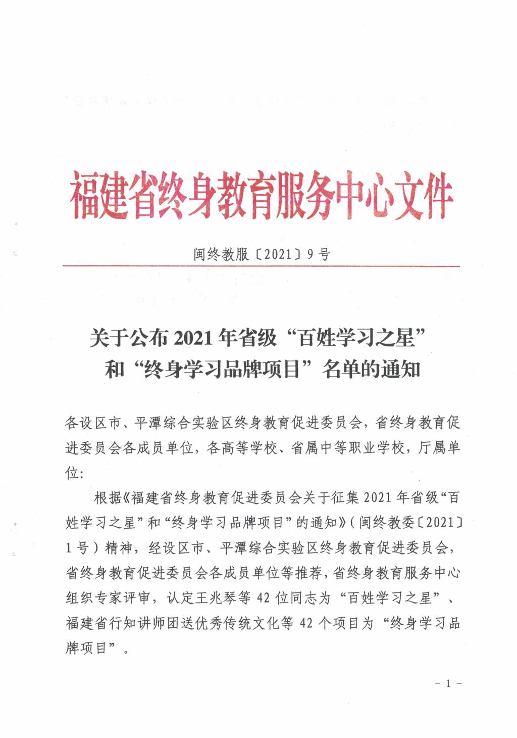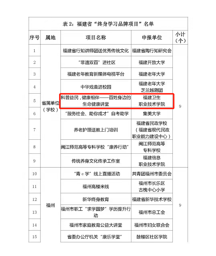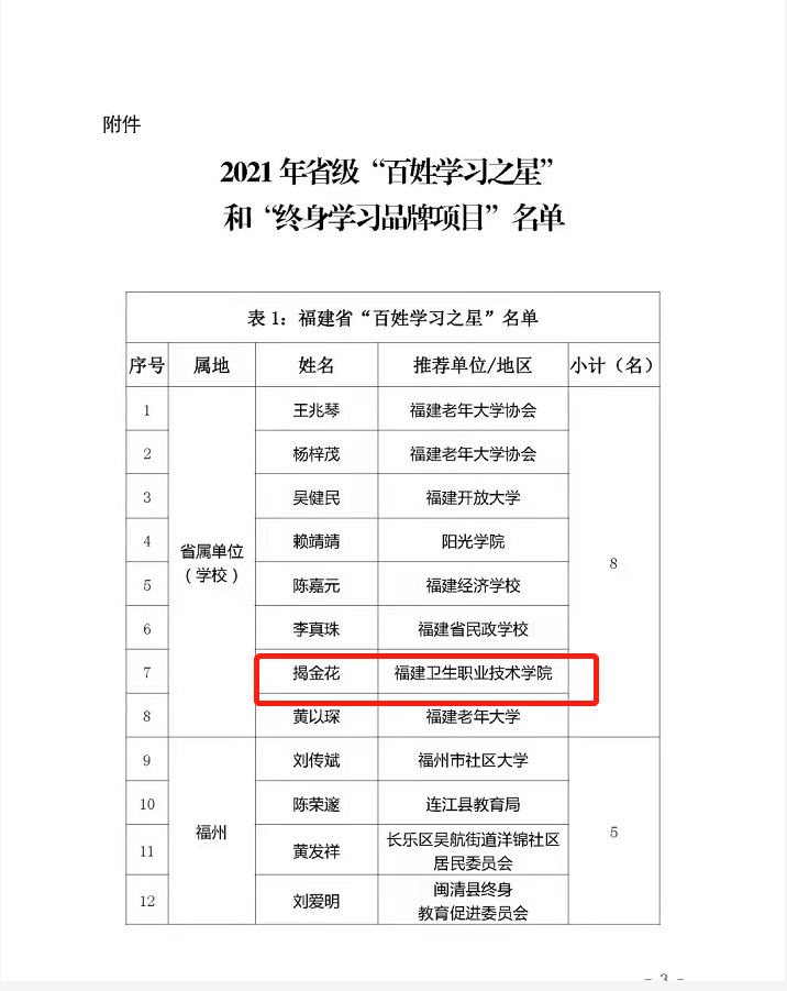 近日,根據(jù)文件《關(guān)于公布2021年省級(jí)“百姓學(xué)習(xí)之星” 和“終身學(xué)習(xí)品牌項(xiàng)目”名單的通知》閩終教服[2021]9號(hào),我校健康管理系揭金花老師認(rèn)定為2021年省級(jí)“百姓學(xué)習(xí)之星”;醫(yī)學(xué)基礎(chǔ)部項(xiàng)目“科普益民,健康相伴——百姓身邊的生命健康講堂”認(rèn)定為2021年省級(jí)“終身學(xué)習(xí)品牌項(xiàng)目”。特此祝賀!