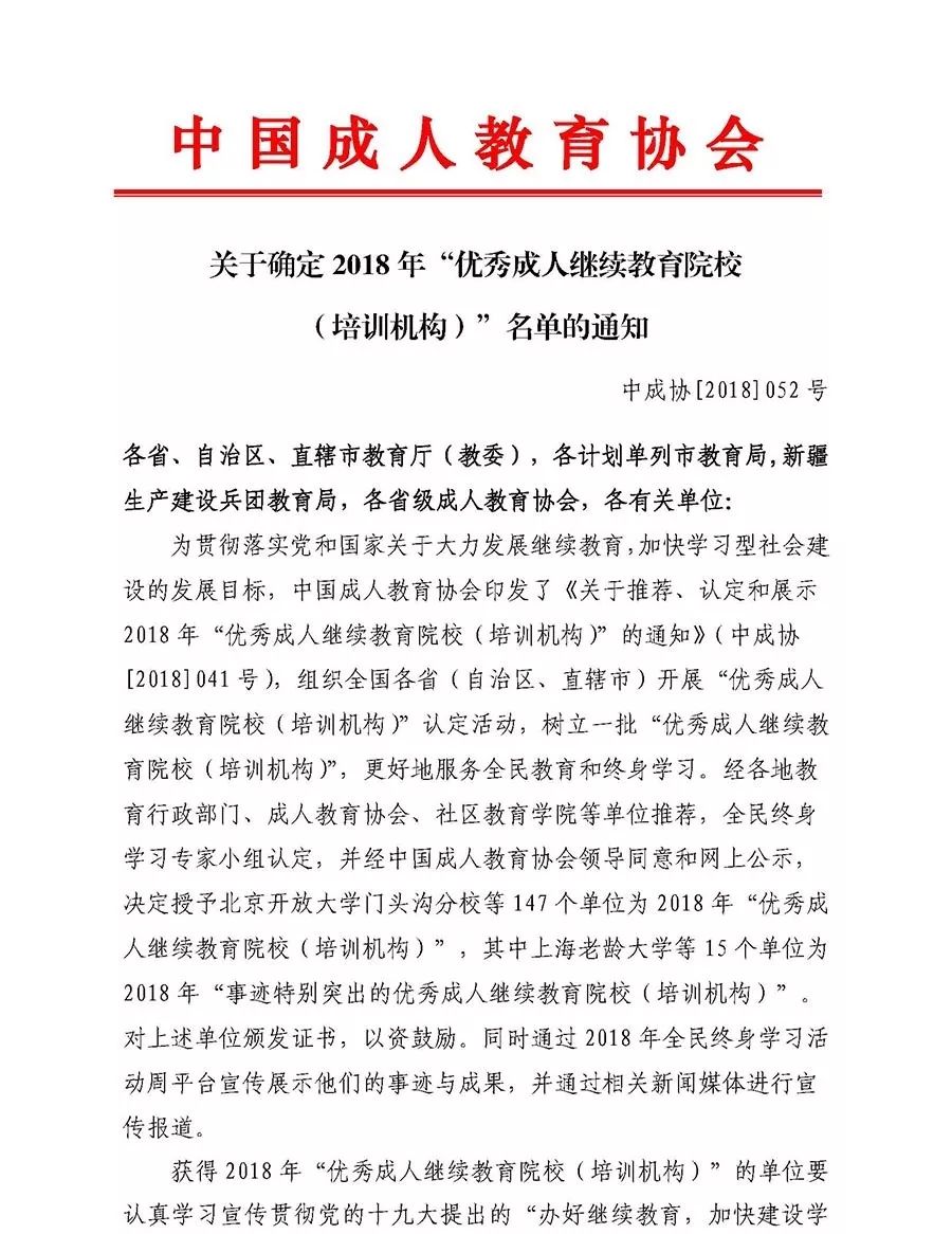 近日,中國(guó)成人教育協(xié)會(huì)發(fā)布了《關(guān)于確定2018年“優(yōu)秀成人繼續(xù)教育院校(培訓(xùn)機(jī)構(gòu))”名單的通知》(中成協(xié)〔2018〕052號(hào)),經(jīng)各地教育行政部門、成人教育協(xié)會(huì)、社區(qū)教育學(xué)院等單位推薦,全民終身學(xué)習(xí)專家小組認(rèn)定,全國(guó)147個(gè)單位被授予“優(yōu)秀成人繼續(xù)教育院校(培訓(xùn)機(jī)構(gòu))”,我院是福建省三個(gè)入選單位中唯一一所高職高專院校。