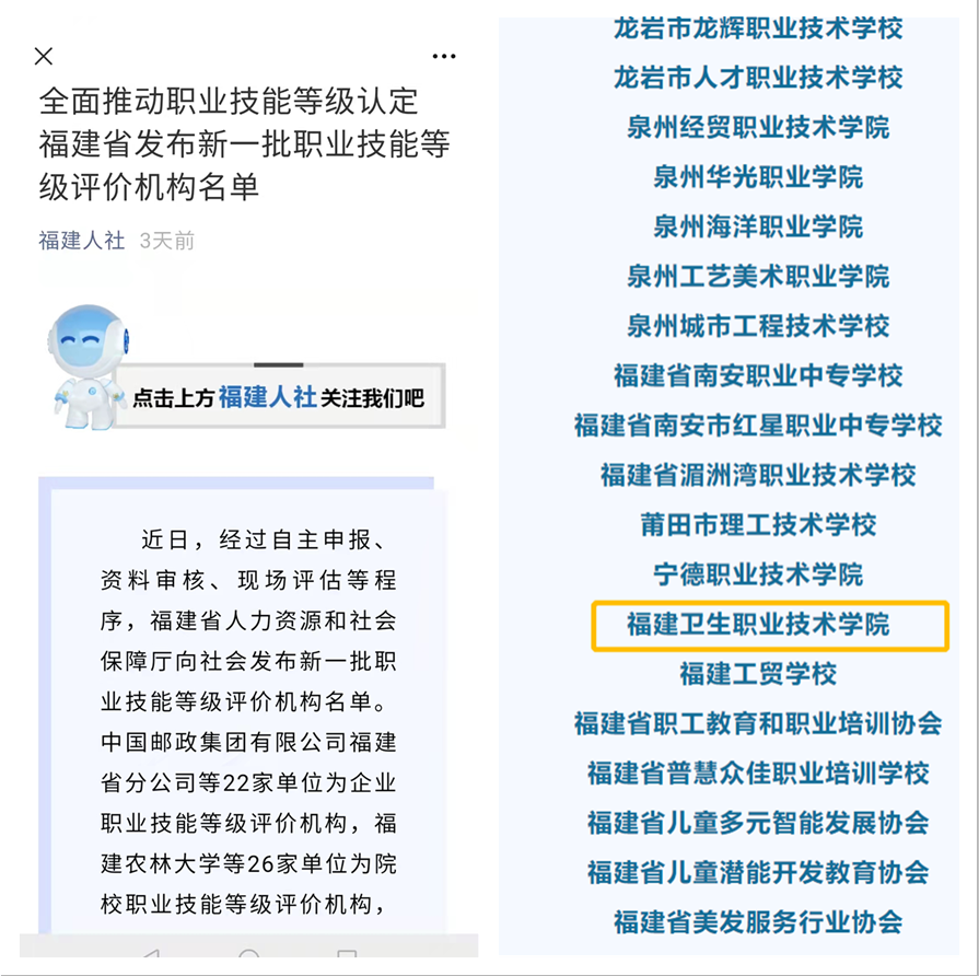 近日,經(jīng)過自主申報、資料審核、現(xiàn)場評估等程序,福建省人力資源和社會保障廳向社會發(fā)布新一批職業(yè)技能等級評價機(jī)構(gòu)名單。我校獲批福建省院校職業(yè)技能等級評價機(jī)構(gòu),認(rèn)定評價工種包含中藥炮制工、醫(yī)藥商品購銷員、藥物制劑工、醫(yī)藥商品購銷員、美容師、養(yǎng)老護(hù)理員、育嬰員、保健按摩師、眼鏡驗(yàn)光員、眼鏡定配工等10個。