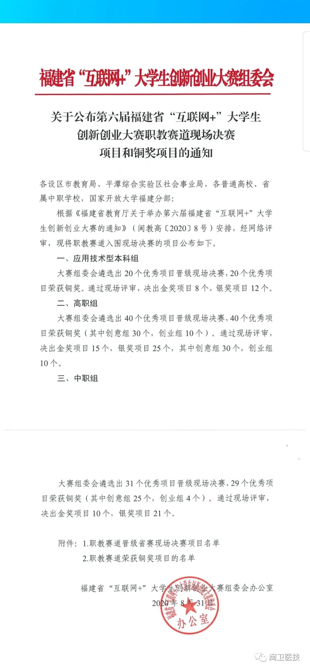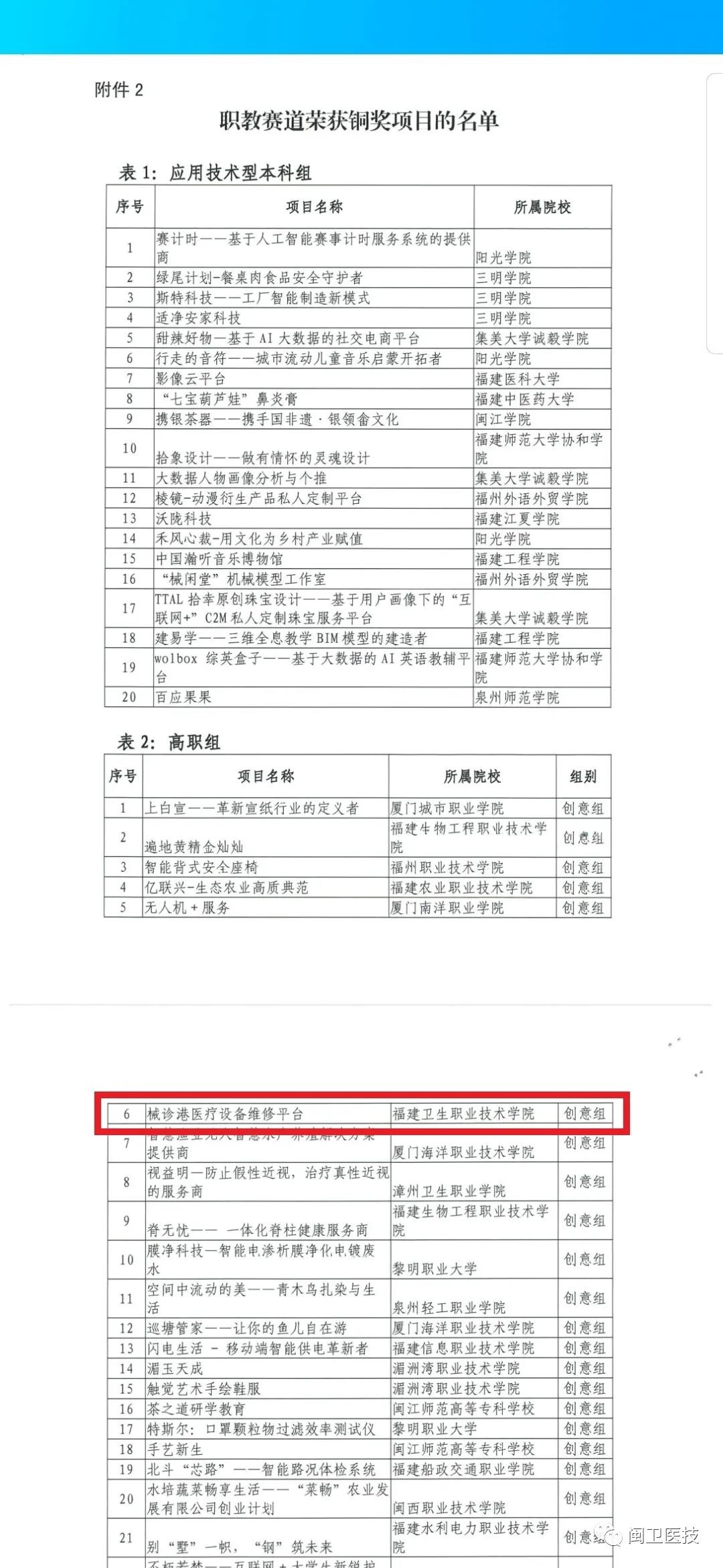 2020年8月31日,第六屆福建省“互聯(lián)網(wǎng)+”大學生創(chuàng)新創(chuàng)業(yè)大賽職教賽道暨第四屆黃炎培海峽職業(yè)教育創(chuàng)新創(chuàng)業(yè)大賽省級初賽網(wǎng)評結(jié)果公布,我院《械診港醫(yī)療設備維修平臺》項目榮獲省級銅獎。該項目由醫(yī)學技術系18影像303班林詩婷、19檢驗301班邱倩玉、17設備301班盧敏、17設備301班鐘林玉、19設備301班劉紫嫻、18影像303班朱麗敏、17投資學謝同心(師大協(xié)和學院)等七位同學共同,醫(yī)學技術系鐘偉雄老師主要指導。
