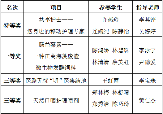 本次大賽由共青團(tuán)福建省委、福建省教育廳、福建省人力資源和社會(huì)保障廳、福建省科學(xué)技術(shù)協(xié)會(huì)、福建省學(xué)生會(huì)聯(lián)合會(huì)共同舉辦,黎明職業(yè)大學(xué)、共青團(tuán)泉州市委承辦。來(lái)自全省35所職業(yè)學(xué)校共計(jì)189件作品中有92件作品入圍終審決賽。我院護(hù)理系《共享護(hù)士——您身邊的移動(dòng)護(hù)理專家》和藥學(xué)系《腸益藻素·一種江蘺海藻廢渣微生物發(fā)酵飼料》成功入圍決賽,經(jīng)過(guò)作品展示、陳述答辯環(huán)節(jié)的激烈角逐,最終在本屆大賽中分別榮獲特等獎(jiǎng)和一等獎(jiǎng),并取得代表福建省參加國(guó)賽的資格。
