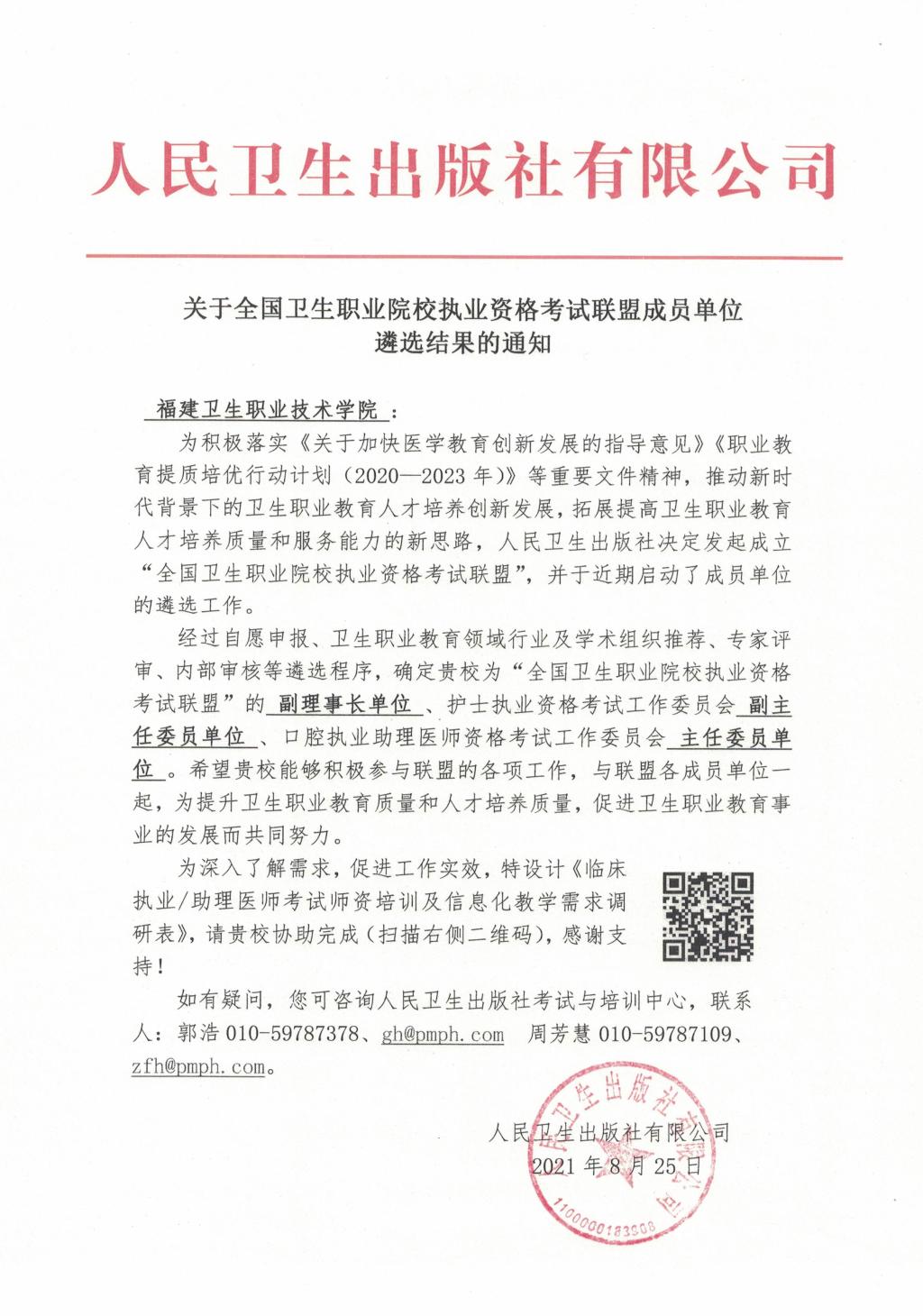 近日,人民衛(wèi)生出版社公布全國(guó)衛(wèi)生職業(yè)院校執(zhí)業(yè)資格考試聯(lián)盟成員單位遴選結(jié)果,我校成功入選“全國(guó)衛(wèi)生職業(yè)院校執(zhí)業(yè)資格考試聯(lián)盟”的副理事長(zhǎng)單位、護(hù)士執(zhí)業(yè)資格考試工作委員會(huì)副主任委員單位和口腔執(zhí)業(yè)助理醫(yī)師資格考試工作委員會(huì)主任委員單位。