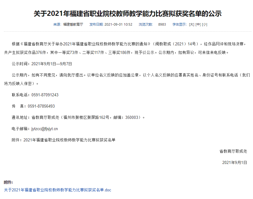 2021年福建省職業(yè)院校教師教學(xué)能力比賽我校擬獲獎(jiǎng)名單匯總表