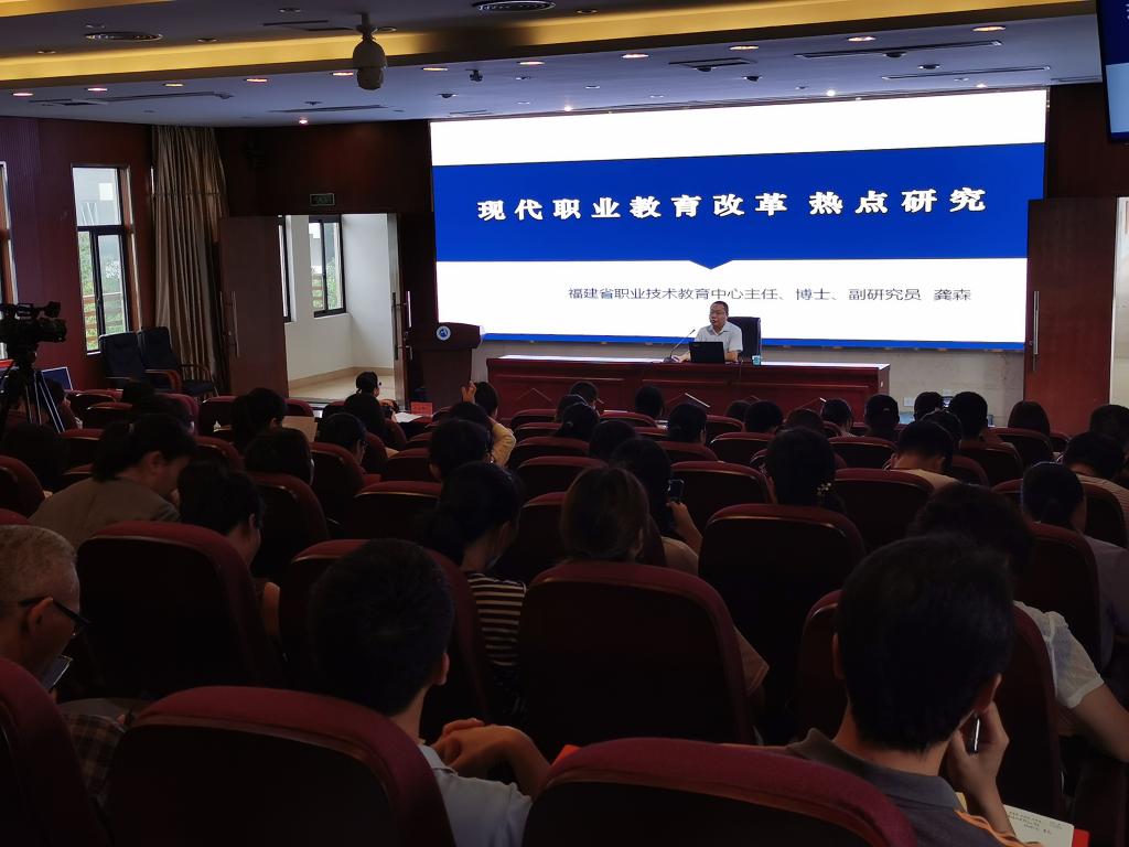 2021年5月13日下午,教務(wù)處邀請福建省職業(yè)技術(shù)教育中心主任龔森博士來我校開展《現(xiàn)代職業(yè)教育改革與研究熱點(diǎn)》專題講座。本次講座在實訓(xùn)樓四樓報告廳舉行,由教務(wù)處副處長李淼淼主持,各系教師及相關(guān)職能部門行政人員聆聽了此次講座。