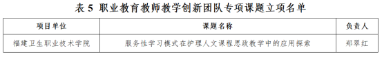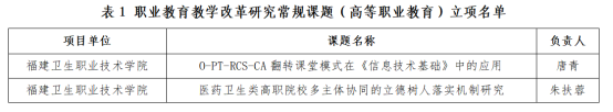 近日,福建省職業(yè)技術(shù)教育中心公布了2022年福建省職業(yè)教育研究課題立項(xiàng)結(jié)果,我校三項(xiàng)課題喜獲立項(xiàng)。其中,朱扶蓉教授主持的《醫(yī)藥衛(wèi)生類(lèi)高職院校多主體協(xié)同的立德樹(shù)人落實(shí)機(jī)制研究》和唐青副教授主持的《O-PT-RCS-CA翻轉(zhuǎn)課堂模式在<信息技術(shù)基礎(chǔ)>中的應(yīng)用》兩項(xiàng)課題獲批“職業(yè)教育教學(xué)改革研究常規(guī)課題”立項(xiàng),鄭翠紅教授主持的《服務(wù)性學(xué)習(xí)模式在護(hù)理人文課程思政教學(xué)中的應(yīng)用探索》獲批“職業(yè)教育教師教學(xué)創(chuàng)新團(tuán)隊(duì)專(zhuān)項(xiàng)課題”立項(xiàng)。