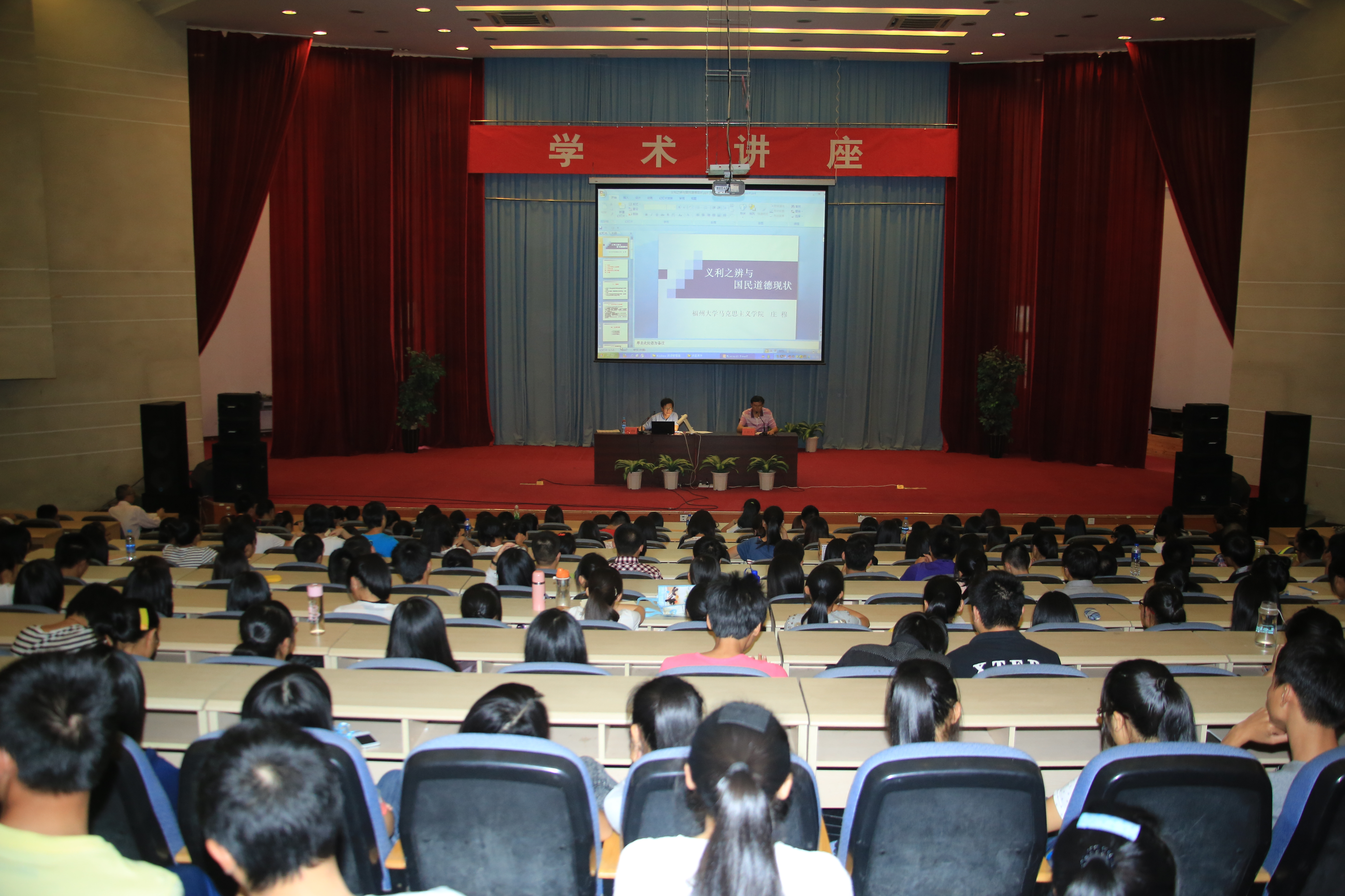 2013年10月15日下午,全國科學(xué)技術(shù)與社會(huì)研究會(huì)副理事長、福建省高校思想政治理論教學(xué)研究會(huì)副會(huì)長、福州大學(xué)馬克思主義學(xué)院院長暨碩士生導(dǎo)師莊穆教授應(yīng)邀為我院師生做了題為《義利之辯與國民道德現(xiàn)狀》的專題講座。我院師生400多人齊聚學(xué)術(shù)廳聆聽了講座。