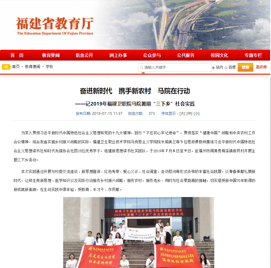 為深入貫徹習(xí)近平新時代中國特色社會主義思想和黨的十九大精神,踐行“不忘初心、牢記使命”,貫徹落實“健康中國”戰(zhàn)略和中央農(nóng)村工作會議精神,結(jié)合我省實施鄉(xiāng)村振興戰(zhàn)略的實際,福建衛(wèi)生職業(yè)技術(shù)學(xué)院馬克思主義學(xué)院院長熊美蘭 、來朋珍、江洪、林美辰、聶小鳳 等5位思政課教師集結(jié)習(xí)近平新時代中國特色社會主義思想讀書社和時代先鋒協(xié)會社團15位優(yōu)秀學(xué)子,組建新思想讀書社實踐隊,于2019年7月6日至9日,赴福州市閩清縣梅溪鎮(zhèn)新民村開展主題三下鄉(xiāng)活動。