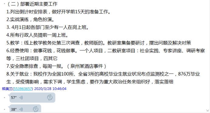 會(huì)上,熊美蘭院長首先傳達(dá)了校防控領(lǐng)導(dǎo)小組第七次工作會(huì)議暨開學(xué)前工作部署會(huì)精神。隨后,熊院長部署了馬院近期主要工作,分別就開學(xué)前15天的準(zhǔn)備工作、實(shí)戰(zhàn)演練,角色扮演、上班人員安排、教學(xué)、經(jīng)費(fèi)使用、安全隱患排查、就業(yè)工作、2020年重點(diǎn)項(xiàng)目建設(shè)、2020年第二屆“衛(wèi)聲杯”之戰(zhàn)“疫”之聲活動(dòng)等13項(xiàng)工作進(jìn)行了認(rèn)真安排和強(qiáng)調(diào)。接著,熊院長傳達(dá)學(xué)院務(wù)虛會(huì)精神及馬院交流匯報(bào)內(nèi)容:《探索構(gòu)建“3+X”思政實(shí)踐課育人模式》。