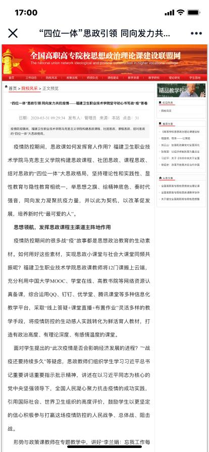 《東南網(wǎng)》3月29日以《四位一體”思政引領(lǐng) 同向發(fā)力共抗疫情——福建一高校堅守初心書寫戰(zhàn)“疫”答卷》對馬克思主義學院進行了報道。