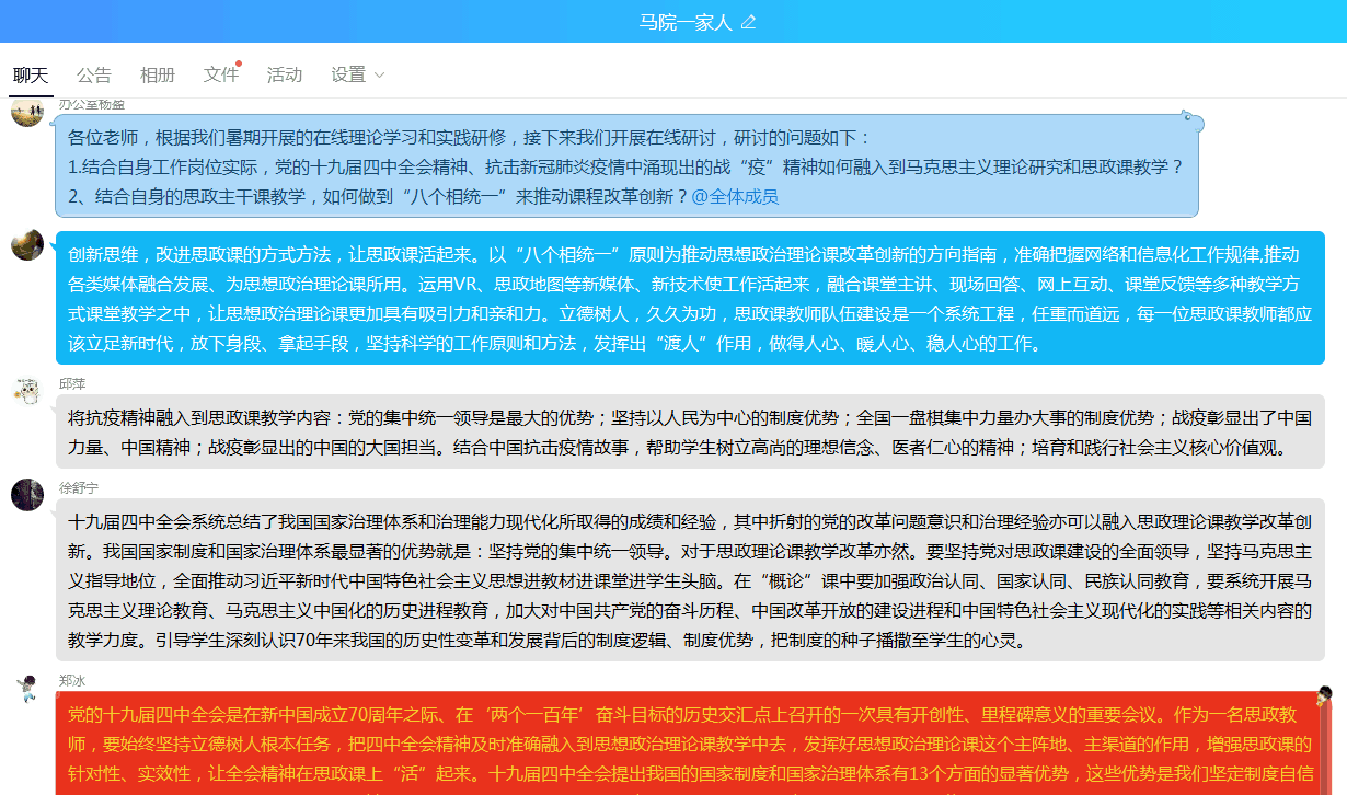 除了開展集中線上理論學(xué)習(xí)外,馬克思主義學(xué)院還組織全體教師開展了集中線上網(wǎng)絡(luò)研討,全體教師分別就“結(jié)合自身工作崗位實際,黨的十九屆四中全會精神、抗擊新冠肺炎疫情中涌現(xiàn)出的戰(zhàn)‘疫’精神如何融入到馬克思主義理論研究和思政課教學(xué)”以及“結(jié)合自身的思政主干課教學(xué),如何做到‘八個相統(tǒng)一’來推動課程改革創(chuàng)新”兩大主題開展了網(wǎng)絡(luò)研討,積極碰撞思維火花,建言獻(xiàn)策,以期更好地推動思政課程教學(xué)改革與創(chuàng)新。研討中,老師們紛紛表示作為思政教師,應(yīng)以“八個相統(tǒng)一”為教育教學(xué)標(biāo)準(zhǔn),增強(qiáng)教書育人本領(lǐng),把“思政小課堂”同“社會大課堂”結(jié)合起來,用心用情講好中國故事,傳播中國好聲音,打造有政治高度、有理論深度、有感情溫度的課堂,增強(qiáng)思政課程的思想性、理論性、親和力和針對性,起到強(qiáng)信心、暖人心、聚民心的作用,幫助青年扣好人生第一??圩?,培養(yǎng)擔(dān)當(dāng)民族復(fù)興大任的時代新人。