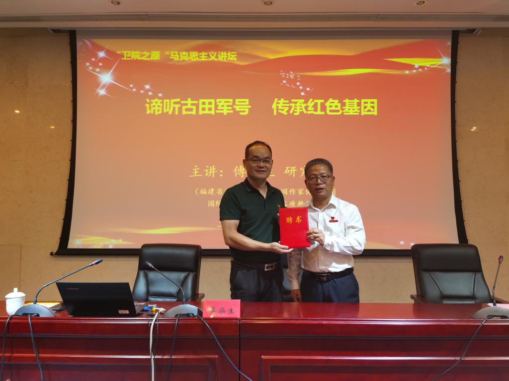 傅柒生局長(zhǎng),曾長(zhǎng)期擔(dān)任古田會(huì)議紀(jì)念館館長(zhǎng),是中國(guó)紅色文化傳播影響力人物,被媒體譽(yù)為“紅色圣地代言人”。講座開始前,現(xiàn)場(chǎng)隆重為傅柒生局長(zhǎng)舉行福建衛(wèi)生職業(yè)技術(shù)學(xué)院客座教授聘任儀式.