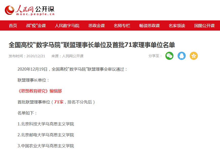 2020年12月19日,經(jīng)由全國高?!皵?shù)字馬院”聯(lián)盟理事會審議,我校馬克思主義學院被評選為全國高校“數(shù)字馬院”聯(lián)盟首批理事單位,福建省僅2家被選上。此次全國高?!皵?shù)字馬院”聯(lián)盟理事會共審議通過全國71家首批聯(lián)盟理事單位。