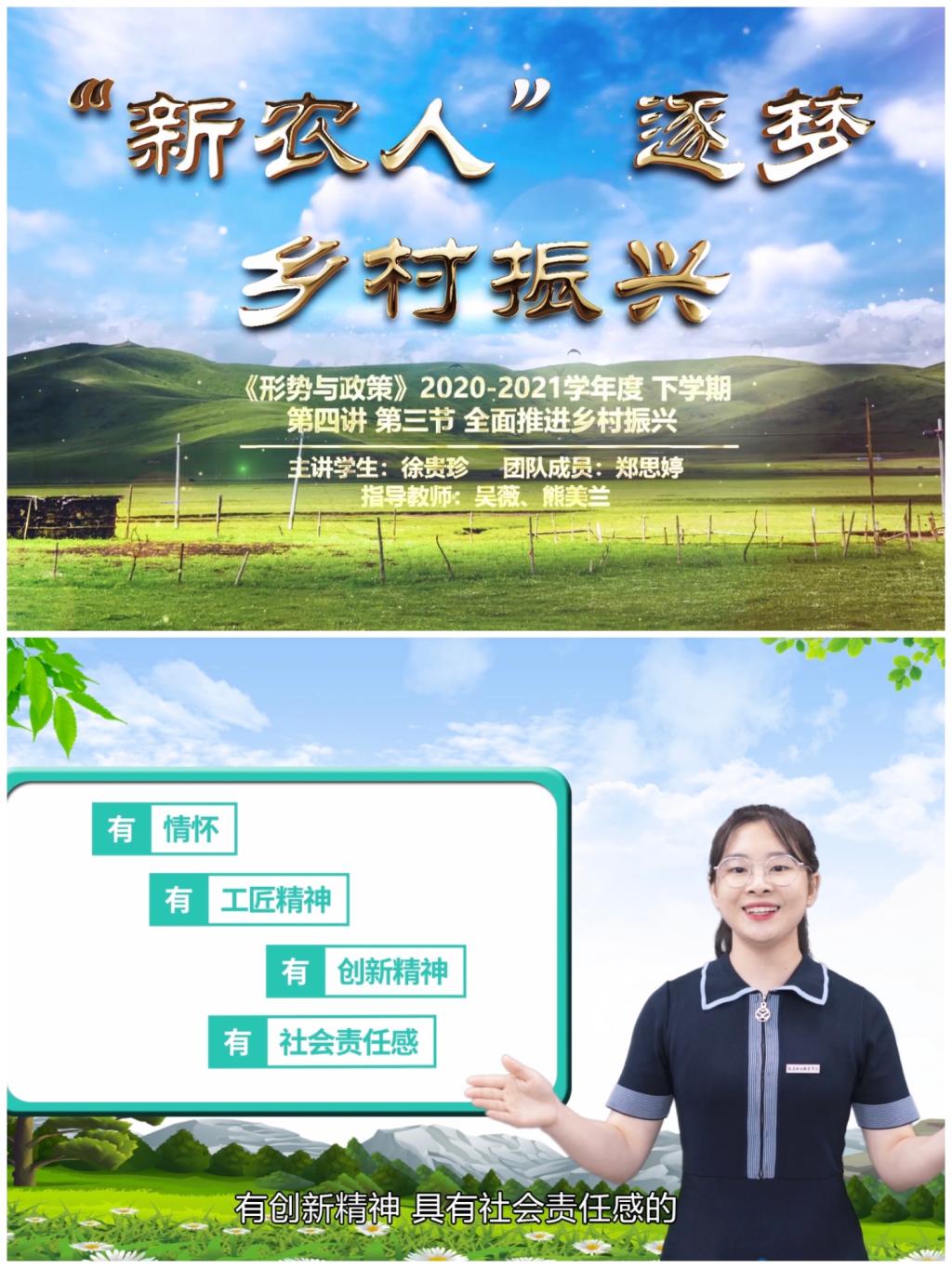 徐貴珍、鄭思婷同學(xué)的參賽作品《“新農(nóng)人”逐夢(mèng)鄉(xiāng)村振興》(指導(dǎo)老師:吳薇、熊美蘭),榮獲“百年輝煌路·奮斗正當(dāng)時(shí)”第五屆全省高校大學(xué)生講思政課公開(kāi)課展示活動(dòng)優(yōu)秀獎(jiǎng)。