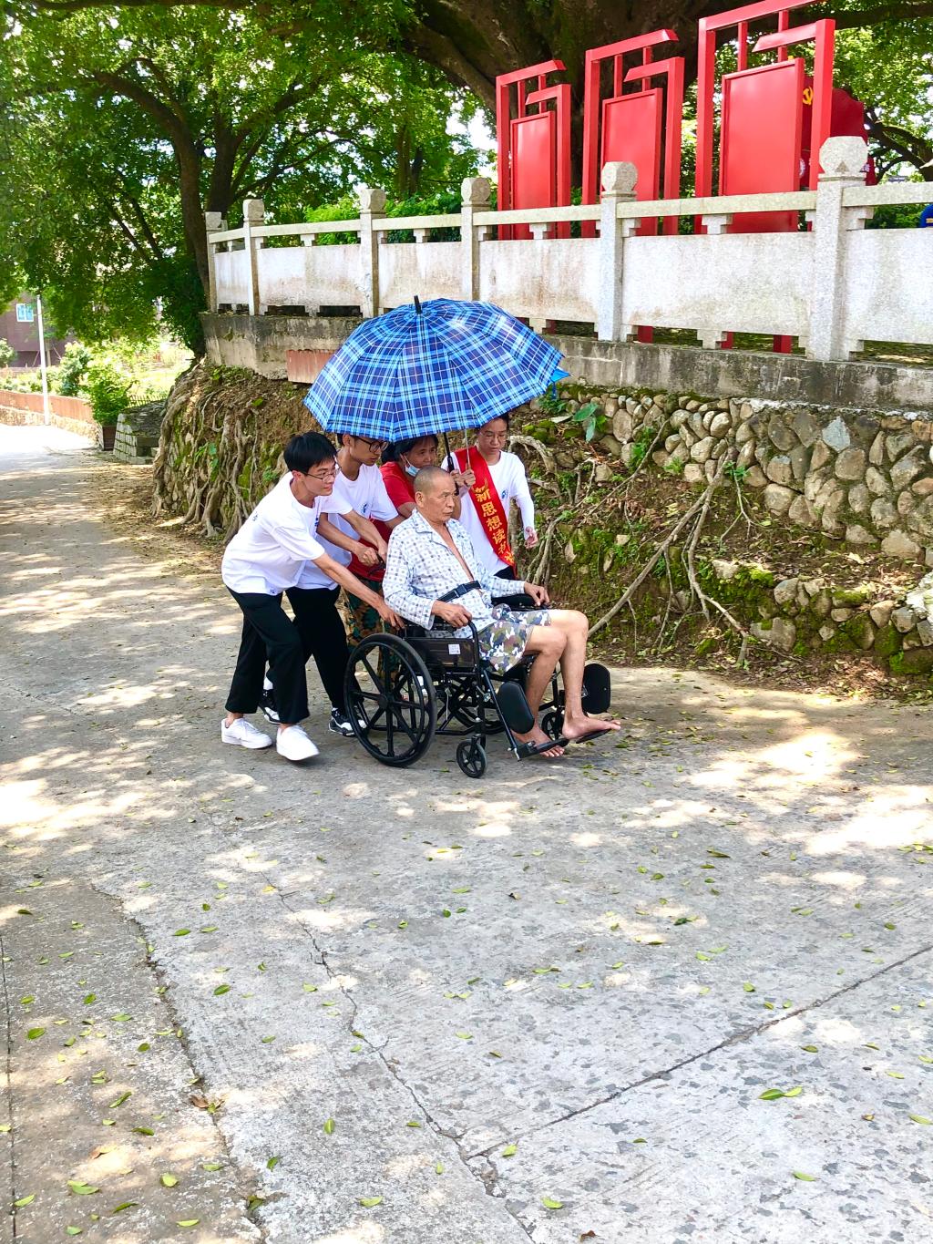 期間我們遇見了一位村民阿姨,在自己接受推拿、拔罐等服務(wù)后,覺得很滿意。她向我們講述了她的困難,她的愛人因手術(shù)后癱瘓?jiān)诖?,平日里靠她進(jìn)行照顧,由于鄉(xiāng)村醫(yī)療、交通條件限制,老人無法定時(shí)去醫(yī)院接受康復(fù)治療,希望我們能夠?yàn)樗睦瞎鲆恍┛祻?fù)醫(yī)療服務(wù)。聽聞了這件事,“馬上逐夢(mèng)隊(duì)”隊(duì)員就自發(fā)要去幫助這名患者,幾位同學(xué)同村民阿姨一起將其老公用輪椅推到位于半山腰上的村部。徐麗鶯老師為其進(jìn)行了肢體的被動(dòng)活動(dòng)和四肢牽伸,并對(duì)她進(jìn)行了康復(fù)醫(yī)療知識(shí)的指導(dǎo)。兩位老人表示非常感謝“馬上逐夢(mèng)隊(duì)”為他們提供的幫助。