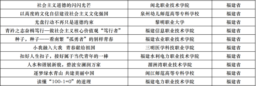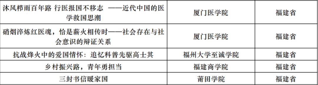 近日,由教育部高校思政課教學(xué)指導(dǎo)委員會主辦的第六屆全國高校大學(xué)生講思政課公開課展示活動評選結(jié)果公布,全國共評選出560件獲獎作品,福建高校43件作品獲獎。獲獎名單如下:
