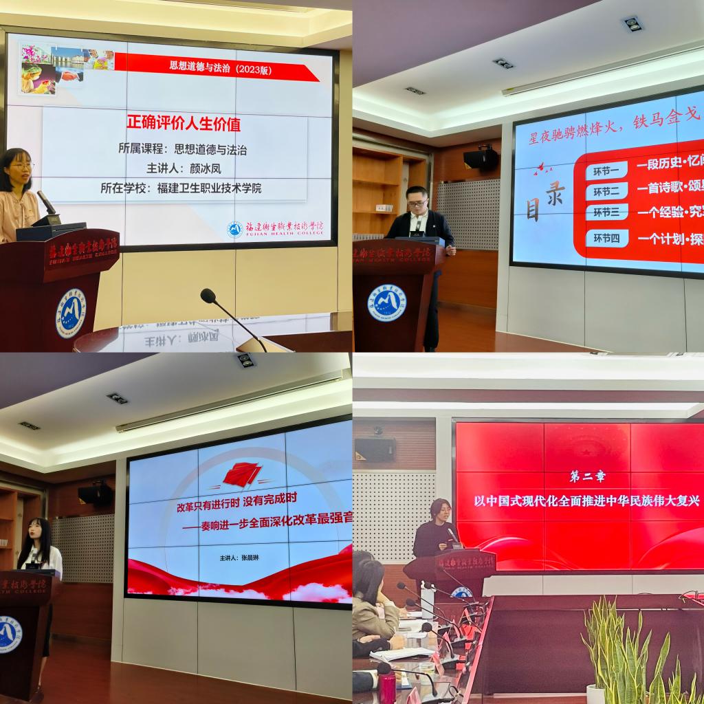 隨后,福州英華職業(yè)學(xué)院李佳瑞,我校劉宗永、張晨琳三位青年教師分別作題為《以中國(guó)式現(xiàn)代化全面推進(jìn)中華民族偉大復(fù)興》《崢嶸閩西歲月 感悟軍事思想——從三打龍巖城看毛澤東軍事智慧》《改革只有進(jìn)行時(shí) 沒有完成時(shí)——奏響進(jìn)一步全面深化改革最強(qiáng)音》的片段教學(xué)展示。
