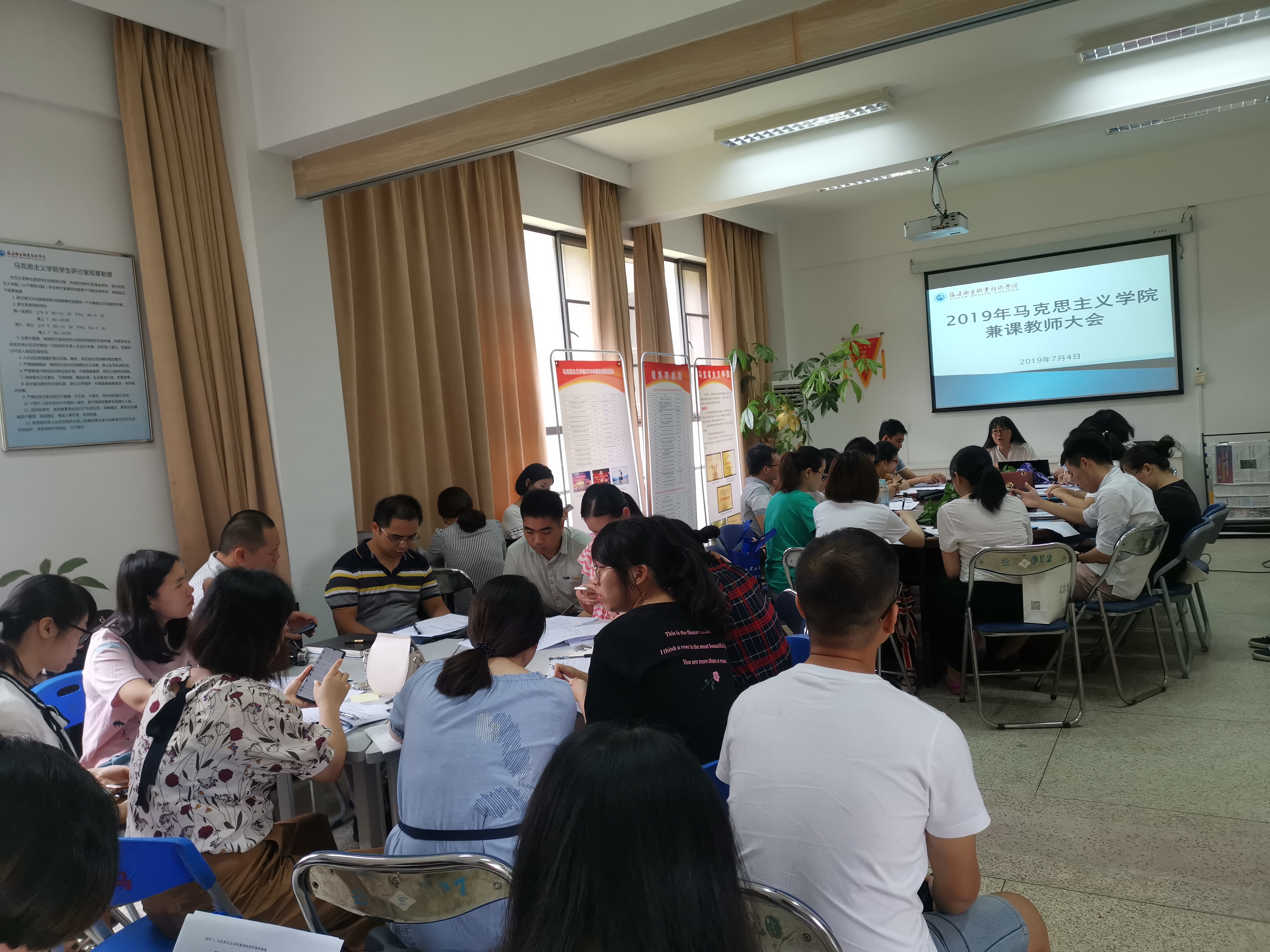 為全面提升教師教學(xué)質(zhì)量,貫徹落實(shí)習(xí)近平總書(shū)記在學(xué)校思政課教師座談會(huì)重要講話(huà)精神,用好課堂教學(xué)這個(gè)主渠道,使馬克思主義學(xué)院(以下簡(jiǎn)稱(chēng)“馬院”)教學(xué)工作逐步走向制度化、規(guī)范化和科學(xué)化的軌道,更上一個(gè)臺(tái)階。2019年7月4號(hào)上午在行政樓107召開(kāi)馬院全體兼課教師大會(huì),馬院院長(zhǎng)熊美蘭主持會(huì)議。