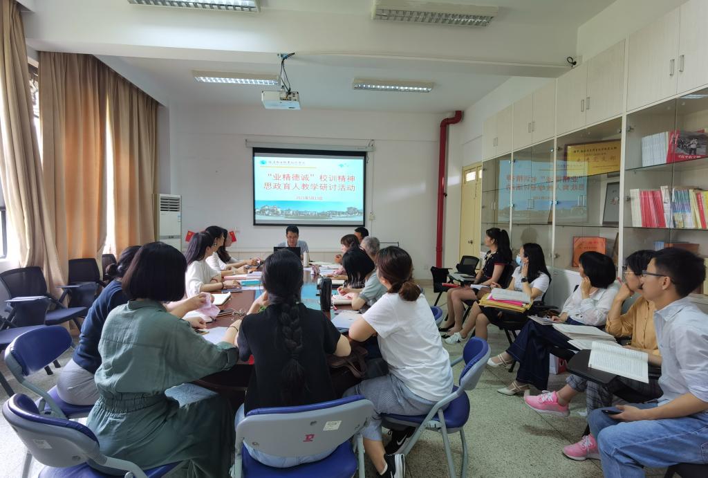 校訓(xùn)是學(xué)校辦學(xué)理念的集中體現(xiàn),是學(xué)校辦學(xué)歷史和優(yōu)良傳統(tǒng)的高度濃縮,更是學(xué)校文化建設(shè)的重要內(nèi)容。為培育思政教師的人文精神,增強(qiáng)思政教師的凝聚力和自豪感,2021年5月13日,馬克思主義學(xué)院于馬院107會(huì)議室開展了“業(yè)精德誠(chéng)”校訓(xùn)精神思政育人教學(xué)研討活動(dòng)?;顒?dòng)由馬克思主義學(xué)院院長(zhǎng)熊美蘭主持。