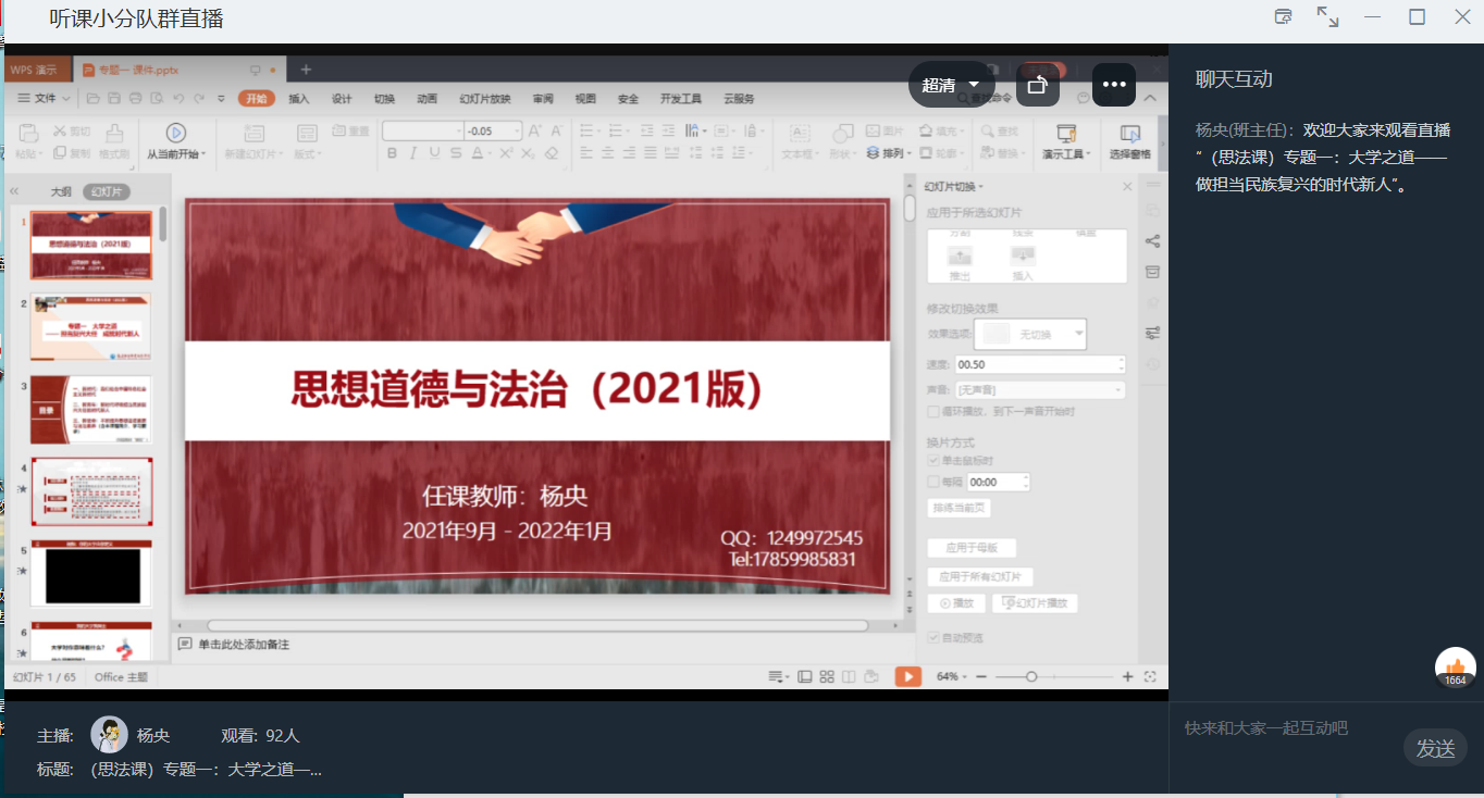 為進(jìn)一步理解2021版《思想道德與法治》新教材,加快課程建設(shè),提升教學(xué)質(zhì)量,使新教師盡快適應(yīng)教學(xué),并遵循科學(xué)防疫的要求?;A(chǔ)教研室于2021年9月17日下午通過(guò)釘釘在線(xiàn)教學(xué)平臺(tái)對(duì)新進(jìn)教師楊央老師開(kāi)展了集中聽(tīng)課活動(dòng),授課對(duì)象是21級(jí)護(hù)理317、318班,授課內(nèi)容是專(zhuān)題一:大學(xué)之道——做擔(dān)當(dāng)民族復(fù)興大任的時(shí)代新人。參與聽(tīng)課的教師有馬克思主義學(xué)院院長(zhǎng)熊美蘭,基礎(chǔ)教研室主任顏冰鳳,馬克思主義學(xué)院教師陳洪月、江洪、羅蕓等。