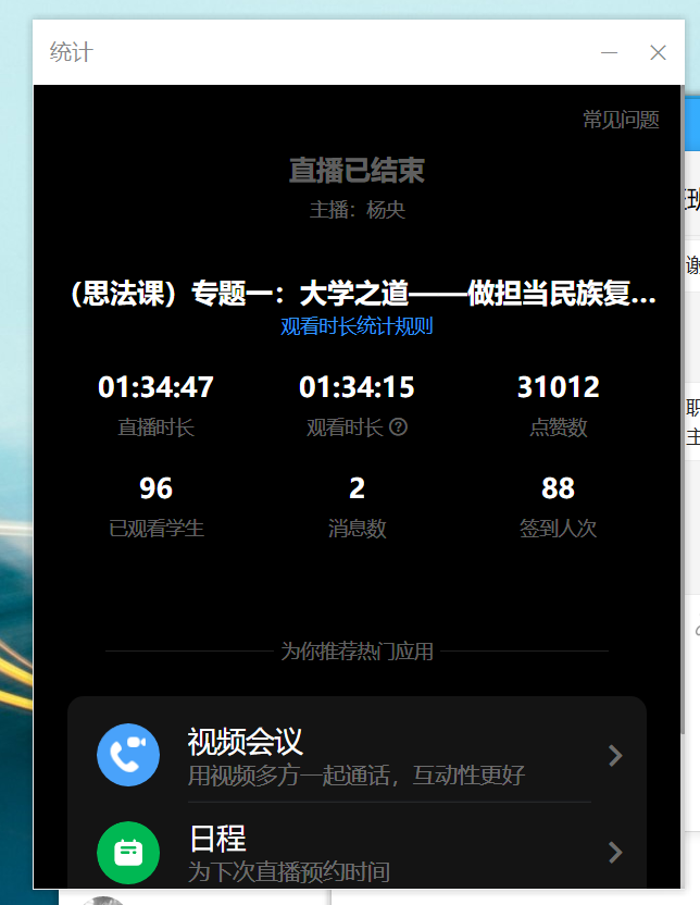 課后,基礎(chǔ)教研室主任顏冰鳳組織各位聽(tīng)課教師對(duì)楊央的線(xiàn)上教學(xué)進(jìn)行教學(xué)評(píng)價(jià)。首先,各位聽(tīng)課教師一致認(rèn)為,楊央備課充分,教態(tài)良好,循循善誘,內(nèi)容熟悉,上課冷靜耐心,聲音語(yǔ)速適中,注意對(duì)學(xué)生的正面引導(dǎo)。然而,也提出不足之處,在網(wǎng)絡(luò)教學(xué)中缺少對(duì)學(xué)生的管理和有效互動(dòng)。最后,提出建議。視頻可以提前上傳至學(xué)習(xí)通平臺(tái),在網(wǎng)絡(luò)不順暢的情況下可以組織學(xué)生課后觀看,不要占用課堂太多時(shí)間建議加強(qiáng)與學(xué)生的互動(dòng),可以出討論題目。