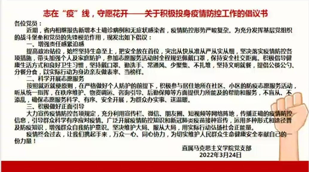 最后,馬克思主義學(xué)院對(duì)全體教師發(fā)出倡議,號(hào)召大家:一是要增強(qiáng)責(zé)任感、緊迫感。疫情防控要突出從快從準(zhǔn)從嚴(yán)從實(shí)從細(xì)原則,以實(shí)際行動(dòng)為身邊親友做表率、當(dāng)榜樣。二是要科學(xué)開展志愿服務(wù)。在嚴(yán)格做好個(gè)人防護(hù)的前提下,積極參與居住地所在社區(qū)、小區(qū)的防疫志愿服務(wù)活動(dòng),為群眾辦實(shí)事、送溫暖。三是積極做好正面引導(dǎo)。大力宣傳疫情防控各項(xiàng)規(guī)定,傳播正確的疫情防控信息,引導(dǎo)群眾科學(xué)有序應(yīng)對(duì)疫情。