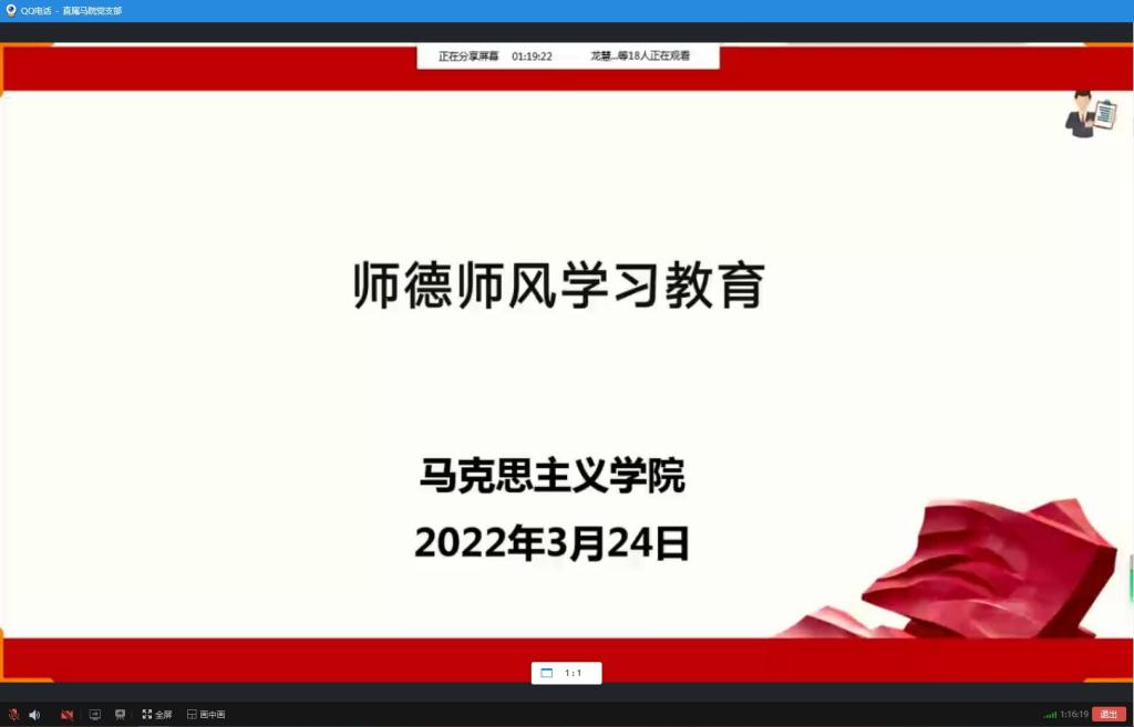 近期學(xué)校周邊出現(xiàn)了本土聚集性疫情,為強(qiáng)化思想引領(lǐng),讓疫情防控成為師德培育的大課堂,2022年3月24日,馬克思主義學(xué)院在線上開展師德師風(fēng)專題學(xué)習(xí),本次學(xué)習(xí)活動(dòng)由馬克思主義學(xué)院院長(zhǎng)熊美蘭主持,馬克思主義學(xué)院全體教師出席本次活動(dòng)。