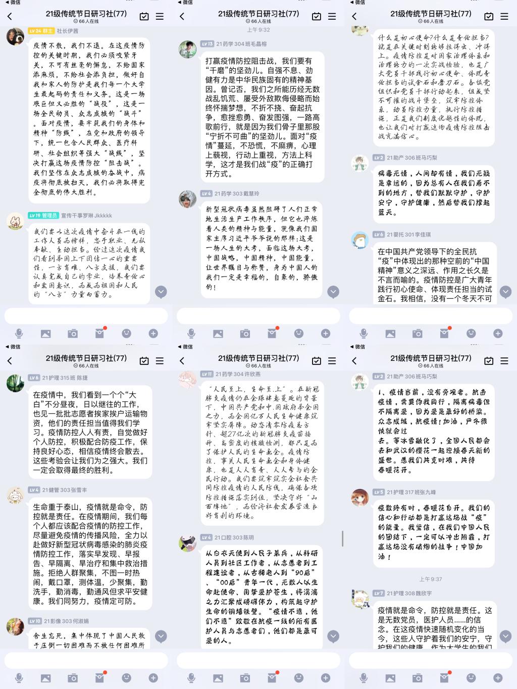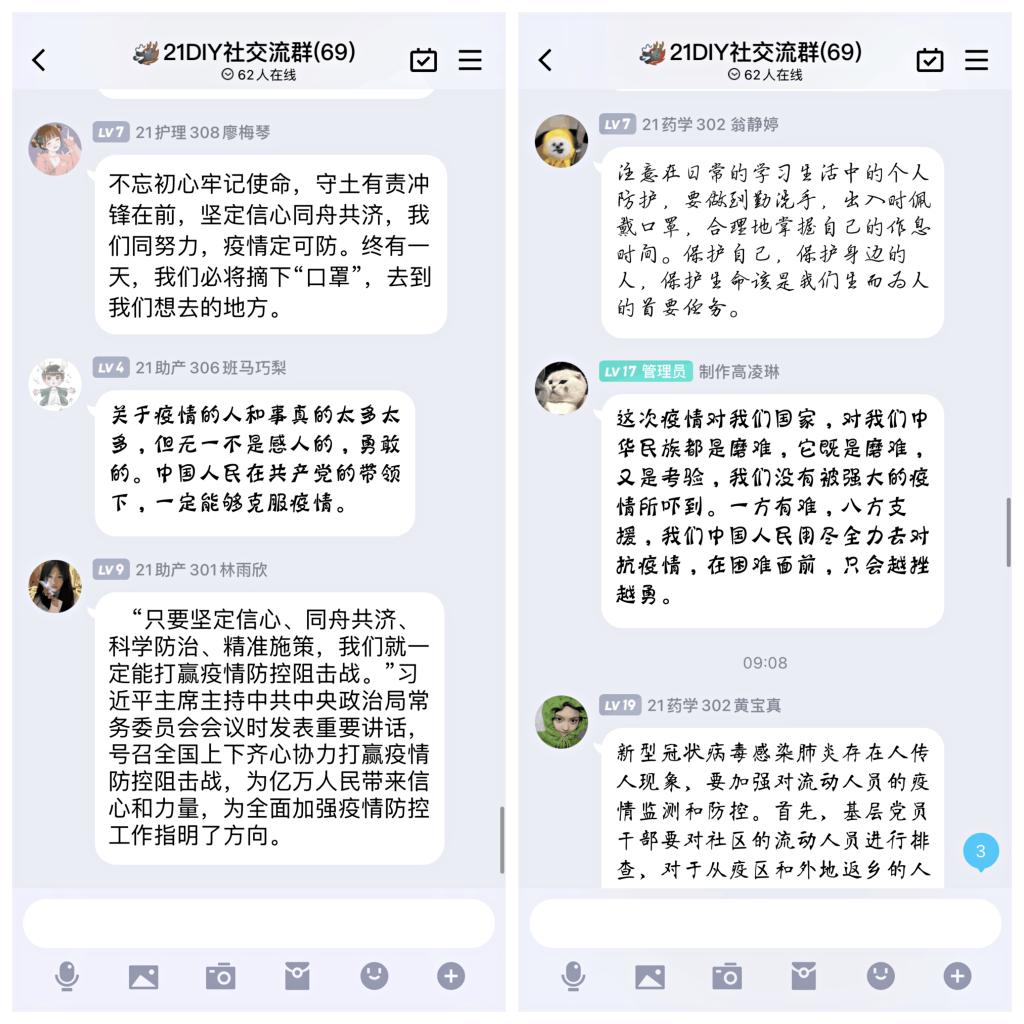20護(hù)理302黃心瑤:歷史反復(fù)證明,只有人民群眾才是歷史的創(chuàng)造者。要戰(zhàn)勝前進(jìn)道路上的任何艱難險(xiǎn)阻,要實(shí)現(xiàn)中華民族偉大復(fù)興的中國(guó)夢(mèng),必須始終做到為了群眾、依靠群眾、凝聚群眾、組織群眾。當(dāng)祖國(guó)需要我們時(shí),我們應(yīng)該沖向前去時(shí),做出我們的選擇去扛起我們的擔(dān)當(dāng)!我作為一名護(hù)理專業(yè)的大學(xué)生,與在抗疫一線的醫(yī)務(wù)工作者相比,我們能做的并不多,也沒有那么危險(xiǎn),我希望可以用自己的實(shí)際行動(dòng)承擔(dān)起青年的責(zé)任,每人力所能及的作出貢獻(xiàn),疫情終有一天驅(qū)散!