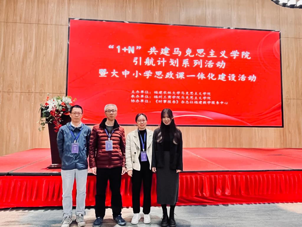 2023年12月9日,“1+N”共建馬克思主義學(xué)院引航計(jì)劃系列活動(dòng)暨大中小學(xué)思政課一體化建設(shè)活動(dòng)在福州工商學(xué)院學(xué)術(shù)交流中心方廣書院舉行。本次活動(dòng)由福建農(nóng)林大學(xué)馬克思主義學(xué)院主辦、福州工商學(xué)院馬克思主義學(xué)院承辦、《時(shí)事報(bào)告》雜志社福建教學(xué)服務(wù)中心協(xié)辦。我院直屬馬克思主義學(xué)院黨支部副書記賴文金、專任教師胡濟(jì)林、徐舒寧、張?zhí)煳膮⒓恿吮敬位顒?dòng)。