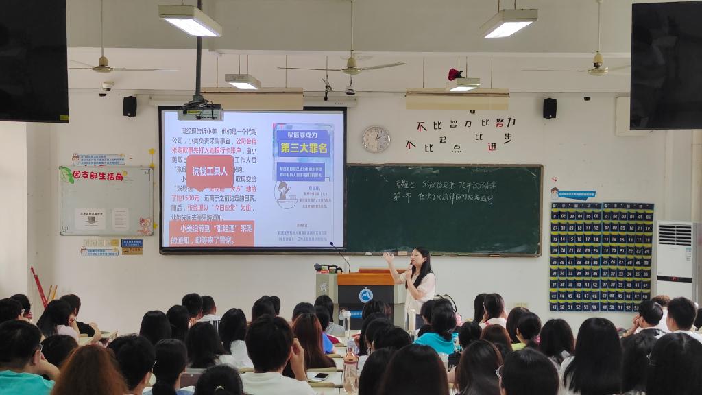 鄒亞彤老師的授課內(nèi)容是“思想道德與法治”課程中的“社會主義法律的特征與運行”專題。鄒亞彤以“幫信罪”進行案例導入,開拓學生法治思維,激發(fā)學生學習興趣。隨后,圍繞“法律的起源、法律的含義、法律的發(fā)展”三個部分展開教學,通過視頻播放、理論講授、師生互動等教學手段,突出重點,突破難點。評課中,同行教師們紛紛對鄒亞彤洪亮的聲音、良好的教態(tài)與教學氛圍的營造予以肯定,同時也提出一些建議:適當降低話筒聲音,適當放慢語速,留給學生信息接收和思考的時間;優(yōu)化教學節(jié)奏,簡化案例導入;探尋更有效的互動方式,調(diào)動后排同學的積極性等。