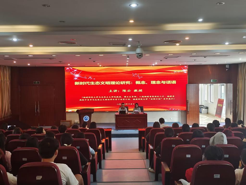 習(xí)近平總書(shū)記強(qiáng)調(diào),發(fā)揮我國(guó)哲學(xué)社會(huì)科學(xué)作用,要注意加強(qiáng)話語(yǔ)體系建設(shè)。建設(shè)生態(tài)文明,是我們黨提出的具有原創(chuàng)性、時(shí)代性的概念和理論。為幫助我校師生從學(xué)理上加深對(duì)綠水青山何以就是金山銀山的辯證理解,推動(dòng)建設(shè)人與自然和諧共生的現(xiàn)代化,2024年10月10日,馬克思主義學(xué)院邀請(qǐng)福建師范大學(xué)馬克思主義學(xué)院陳云教授在篤行樓四樓報(bào)告廳開(kāi)展《新時(shí)代生態(tài)文明理論研究:概念、理念與話語(yǔ)》的專題講座。講座由馬克思主義學(xué)院副院長(zhǎng)來(lái)朋珍主持,馬克思主義學(xué)院全體專兼課教師、學(xué)生代表參加。