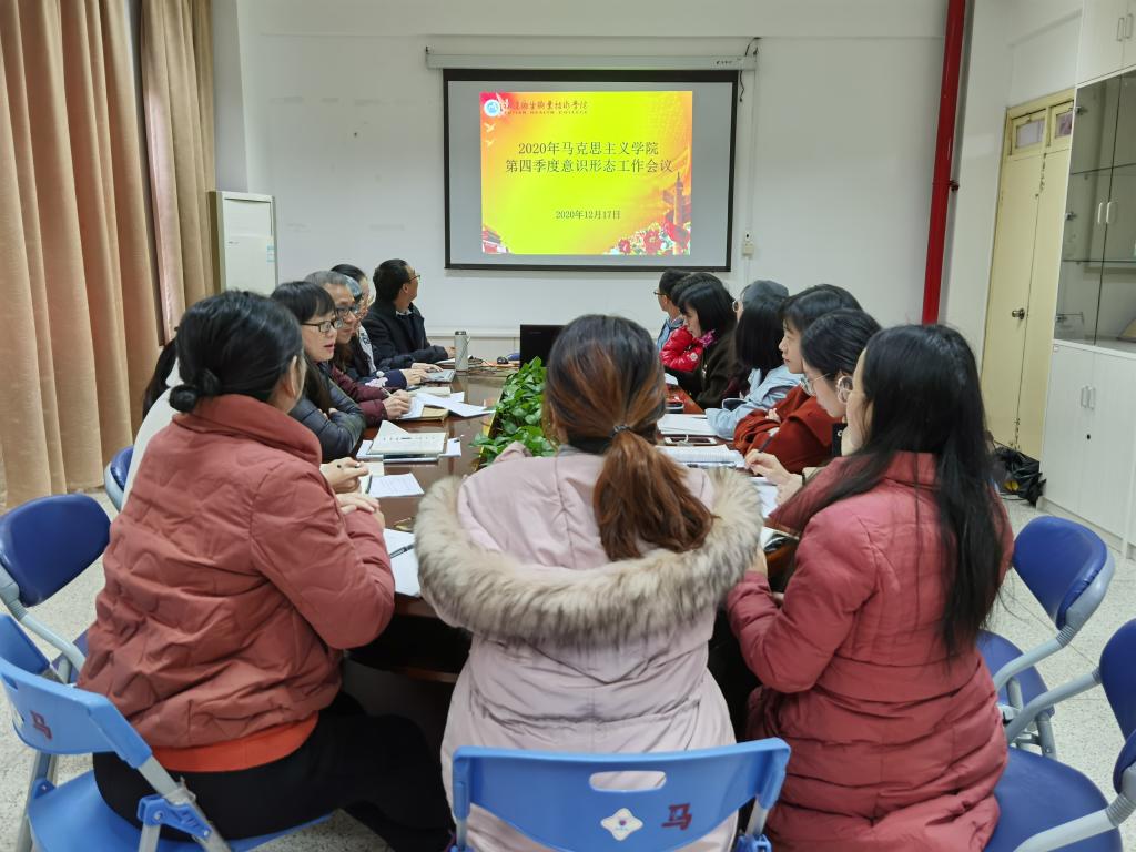 2020年12月17日上午,馬克思主義學(xué)院在行政樓107會議室召開2020年第四季度意識形態(tài)工作會議。會議由馬克思主義學(xué)院黨支部書記熊美蘭主持,馬院全體教師黨員參加會議。