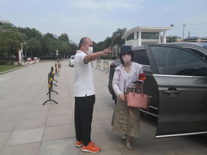 馬克思主義學(xué)院院長熊美蘭扮演學(xué)生家長,自駕驅(qū)車帶領(lǐng)扮演學(xué)生的顏冰鳳老師來到學(xué)校,到校門口后,學(xué)生家長就此離開校園。