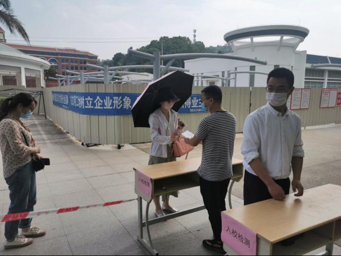 考生接受工作人員核驗(yàn)身份、檢查“閩政通”健康碼、測量體溫。