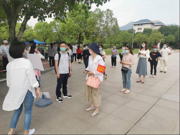 考生間隔1米排隊(duì)等待工作人員檢測。