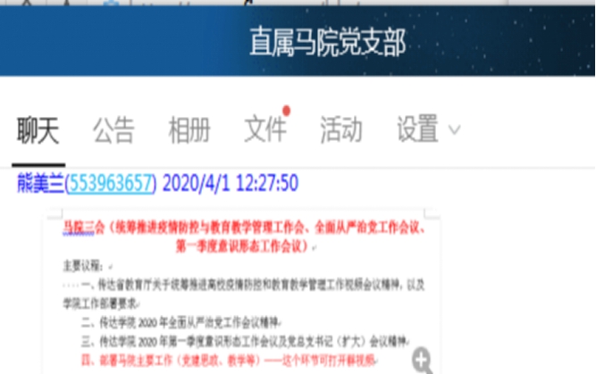 “疫情就是命令,防控就是責任”。2020年4月1日,直屬馬克思主義學院黨支部通過網絡視頻召開統(tǒng)籌推進高校疫情防控和教育教學管理工作會議。會議由支部書記熊美蘭主持,全體教師黨員參加了會議。