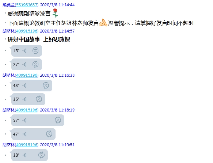 馬克思主義學院名譽院長兼就業(yè)指導和軍事理論教研室魏立娜教授和概論教研室主任胡濟林副教授分別發(fā)表了學習體會。魏立娜教授以“堅守教師本色,當好抗疫‘戰(zhàn)斗員’--學習2.23中央會議精神”為主題,結合教研室教學和崗位工作,闡述了2.23中央會議的主要精神和如何當好抗疫“戰(zhàn)斗員”,表示對黨中央的堅強領導充滿信心,中國一定能戰(zhàn)勝這場新冠肺炎疫情,并且保持經(jīng)濟社會的良好發(fā)展勢頭。胡濟林副教授從當前《毛澤東思想與中國特色社會主義概論》課的教學出發(fā),圍繞“講好中國故事 上好思政課”這個主題,深入介紹了三點內容:挖掘教材內容,找準“抗疫”故事與教材內容的結合點;用真實的語言講好中國故事;探索多元方式,師生共同講好中國故事。