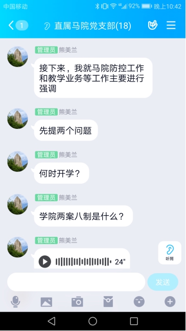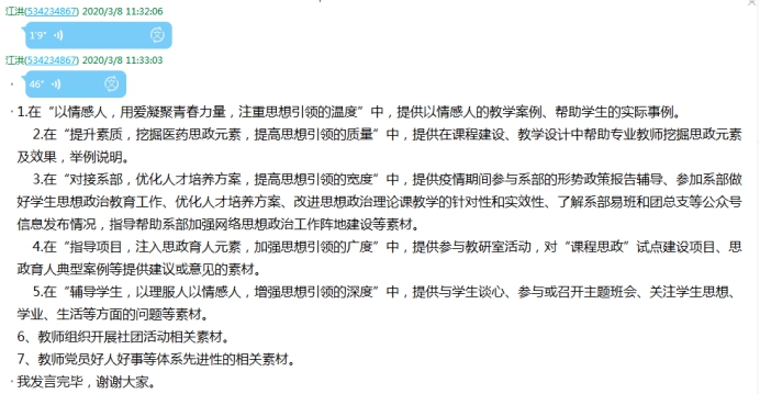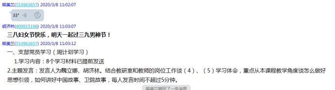 最后熊美蘭書記就此次馬院馬院疫情防控工作會議暨支部黨員學習會進行了總結講話。熊書記首先就學校何時開學和什么是學?!皟砂赴酥啤眱蓚€問題進行了說明,強調我們既要一手抓疫情防控,又要一手抓教學科研、行政等各方面工作,確保兩手都要抓好,充分表揚了黨員教師們這段時間表現(xiàn)出的敢打敢拼的精氣神。接著,總結了這一周以來馬院在宣傳報道上取得的可喜的成績,成績來之不易,也得到了學校領導的充分肯定,希望同志們繼續(xù)努力,同心協(xié)力一起把馬院的宣傳工作做好。同時,熊書記也指出開學以來開展的網(wǎng)絡教學總體上同學是比較認可的,但也存在一些問題,希望老師們認真去研究這些問題,并盡可能想辦法解決這些問題,充分保證學生學習效果。最后熊書記再次表達了對女教師們三八婦女節(jié)節(jié)日的祝福,祝愿女教師們節(jié)日快樂、身體健康、工作順利!